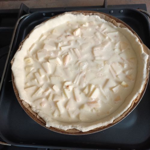 Mélanger 20 cl de crème épaisse + 2 oeufs + 2 cuillères à soupe de sucre ; verser sur les pommes.