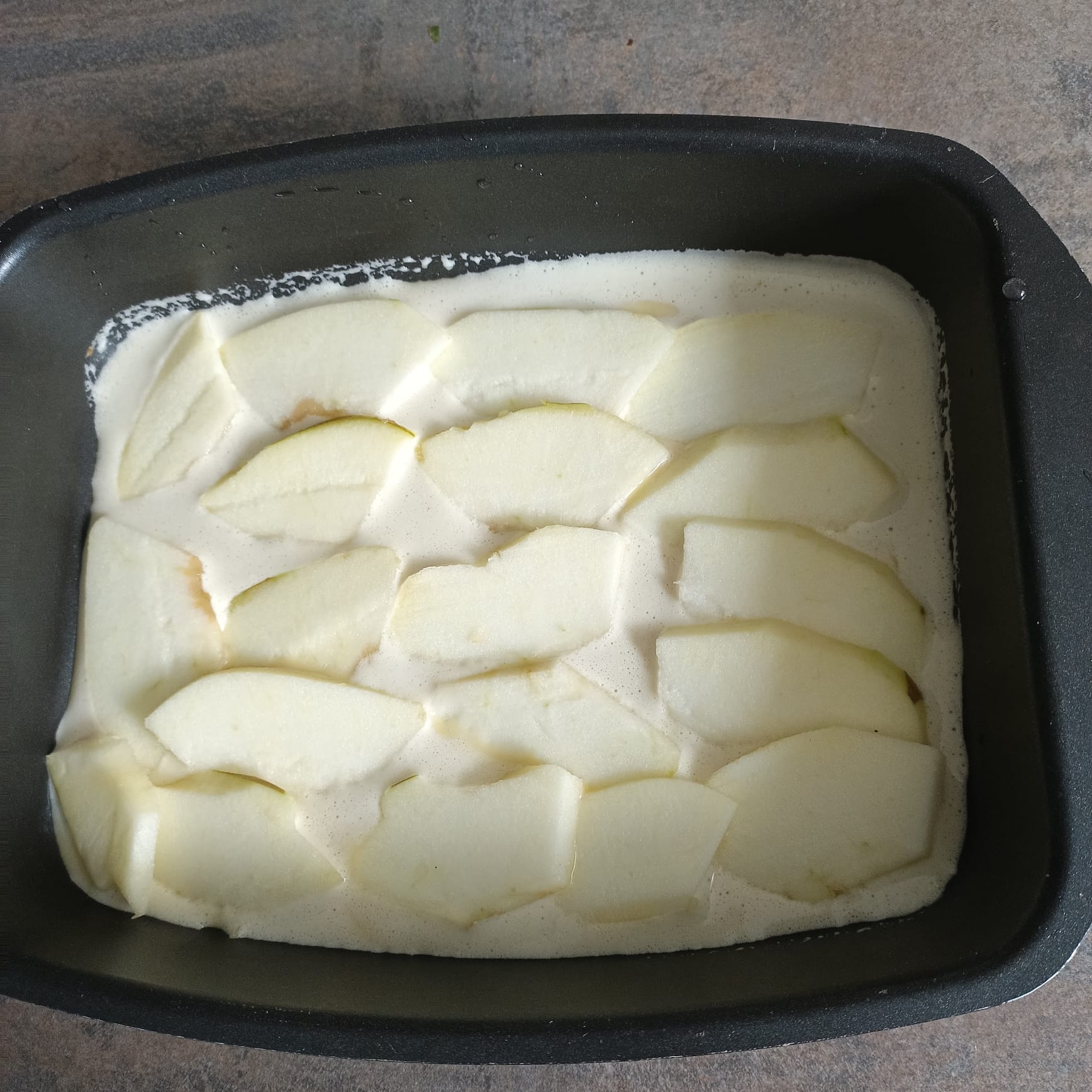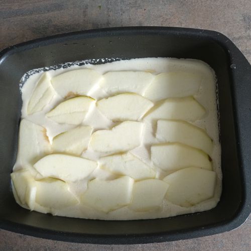 Déposer un peu de pâte dans le plat ; ajouter des lamelles de pomme.