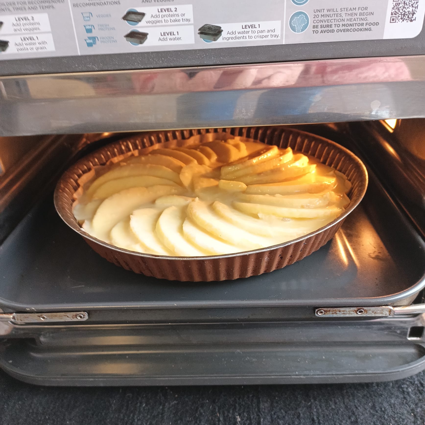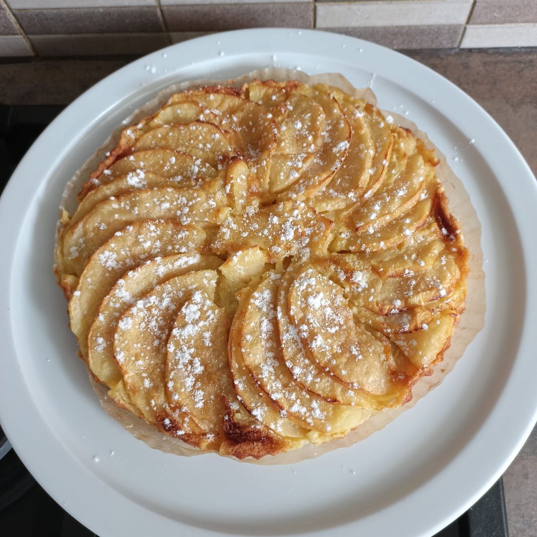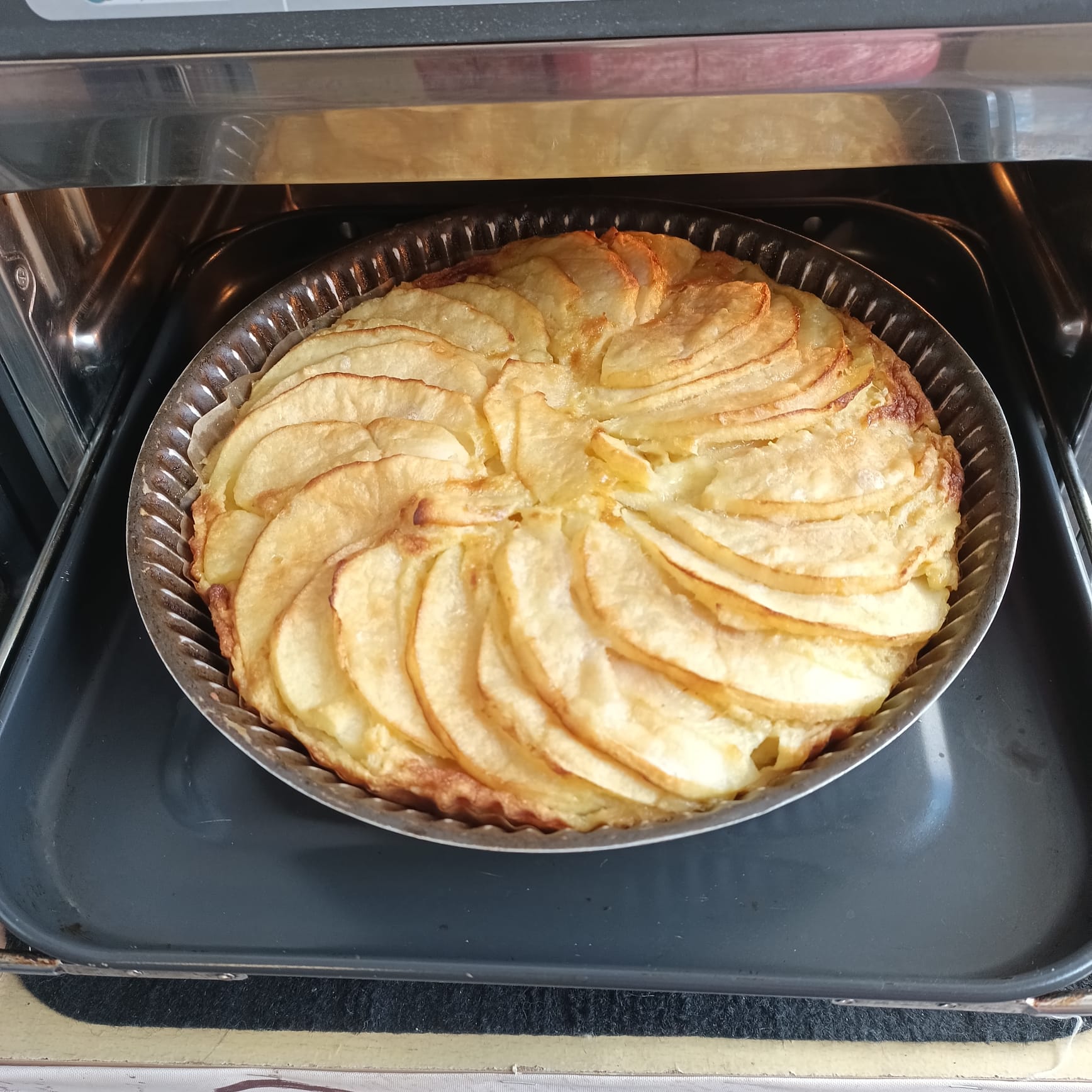 Mélanger 2 oeufs + 40 g de sucre + vanille liquide + 70 g de farine + 12 cl de lait demi-écrémé + 40 g de beurre fondu ; verser cette préparation sur les pommes.