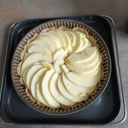 Déposer du papier cuisson sur une tourtière de 27 cms environ ; Eplucher et découper des tranches de pommes et les déposer sur le papier cuisson.
