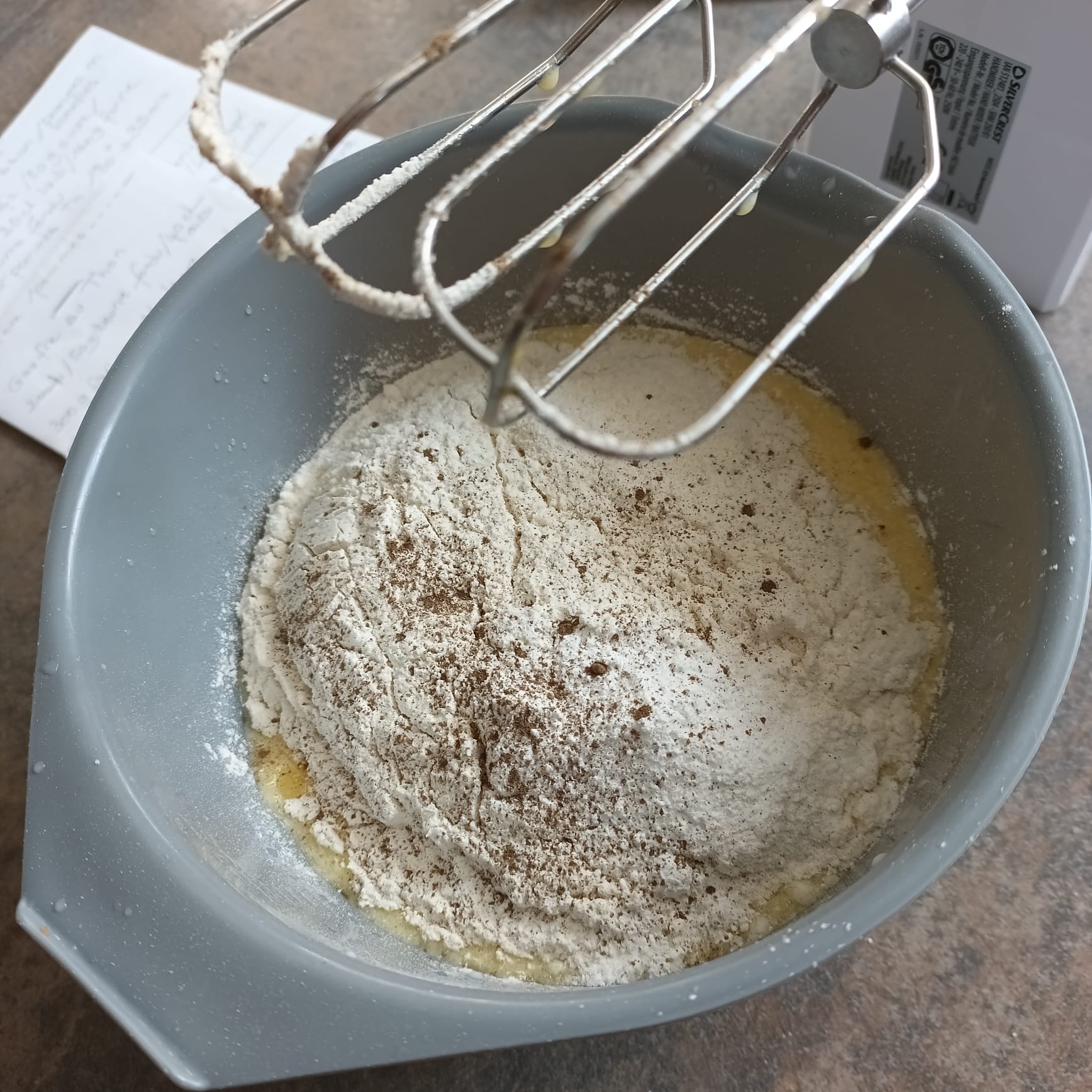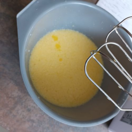 Mélanger 2 oeufs + 50 g de beurre fondu + 40 cl de lait demi-écrémé