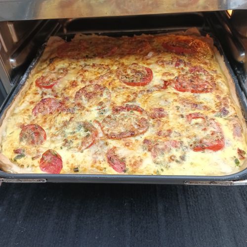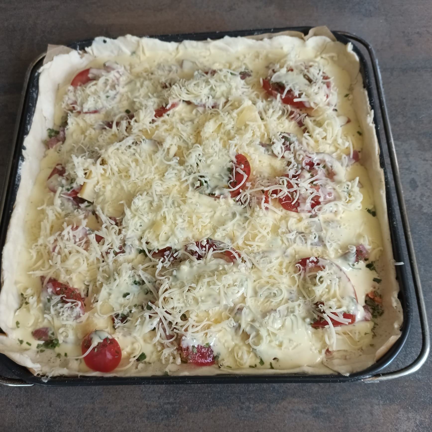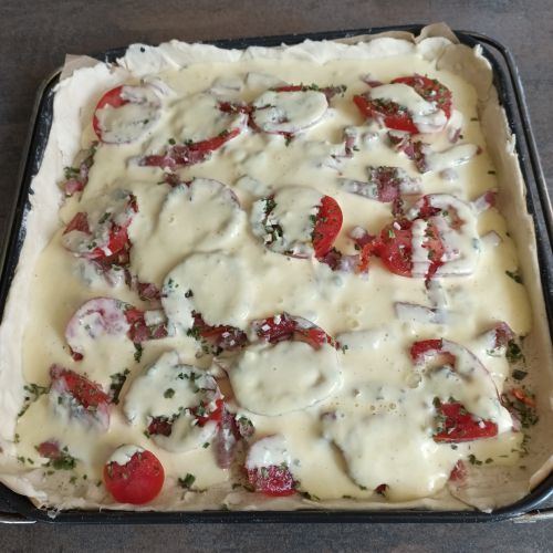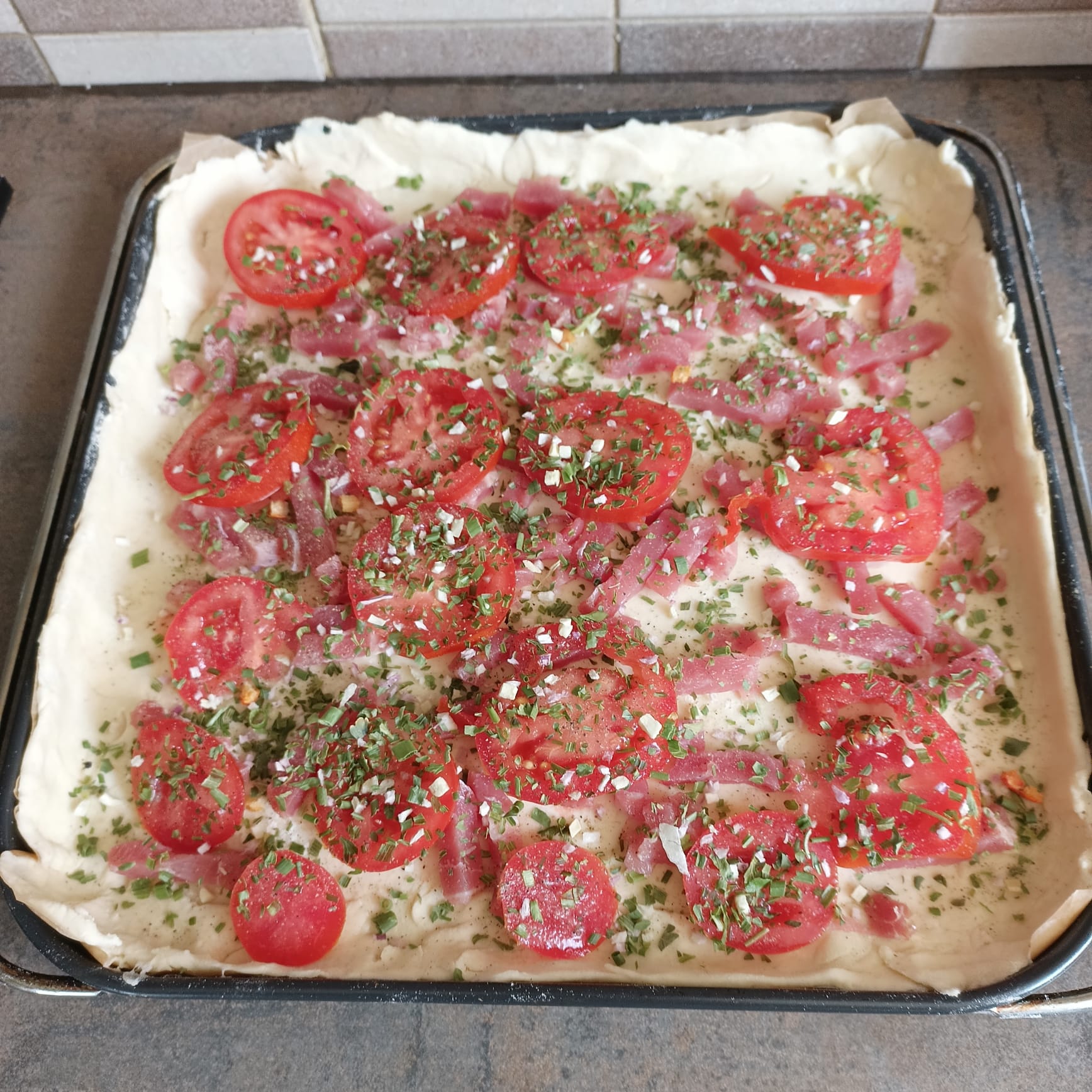 3 ou 4 tomates en rondelles + 150 g de lardons fumés de volaille