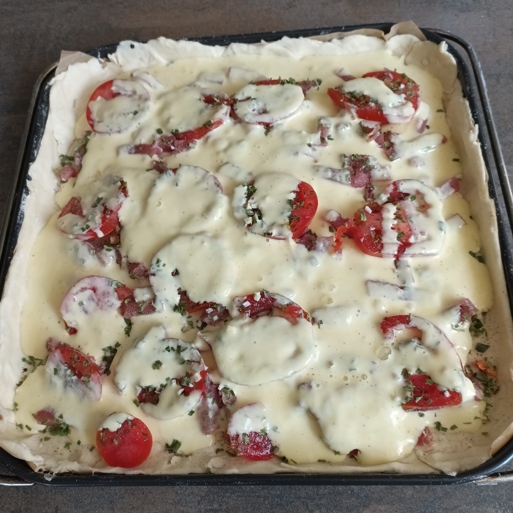 20 cl de crème liquide + 3 oeufs + 20 cl de lait + sel poivre et Comté râpé.