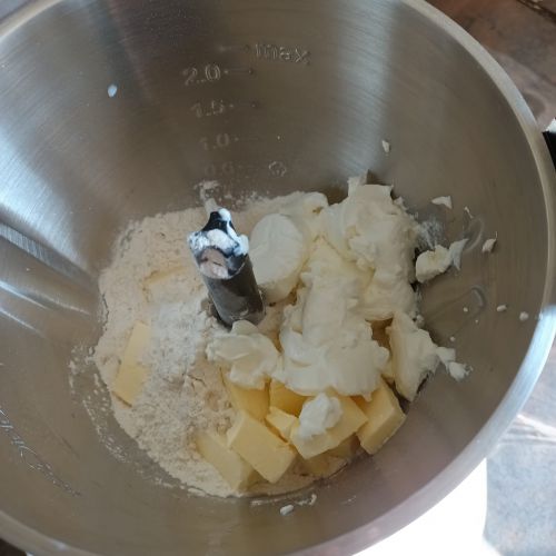 3 petits suisses + 80 g de beurre mou + 1 cuillère café de sel + 180 g de farine . Mélanger le tout . Etaler la pâte et la déposer sur du papier cuisson avec de la farine entre la pâte et le papier.