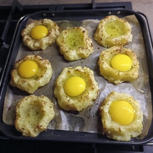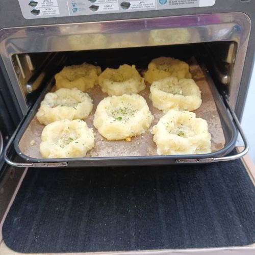 Préparer une purée et faire des nids. Saler, poivrer. Verser un peu de persillade dans le creux.