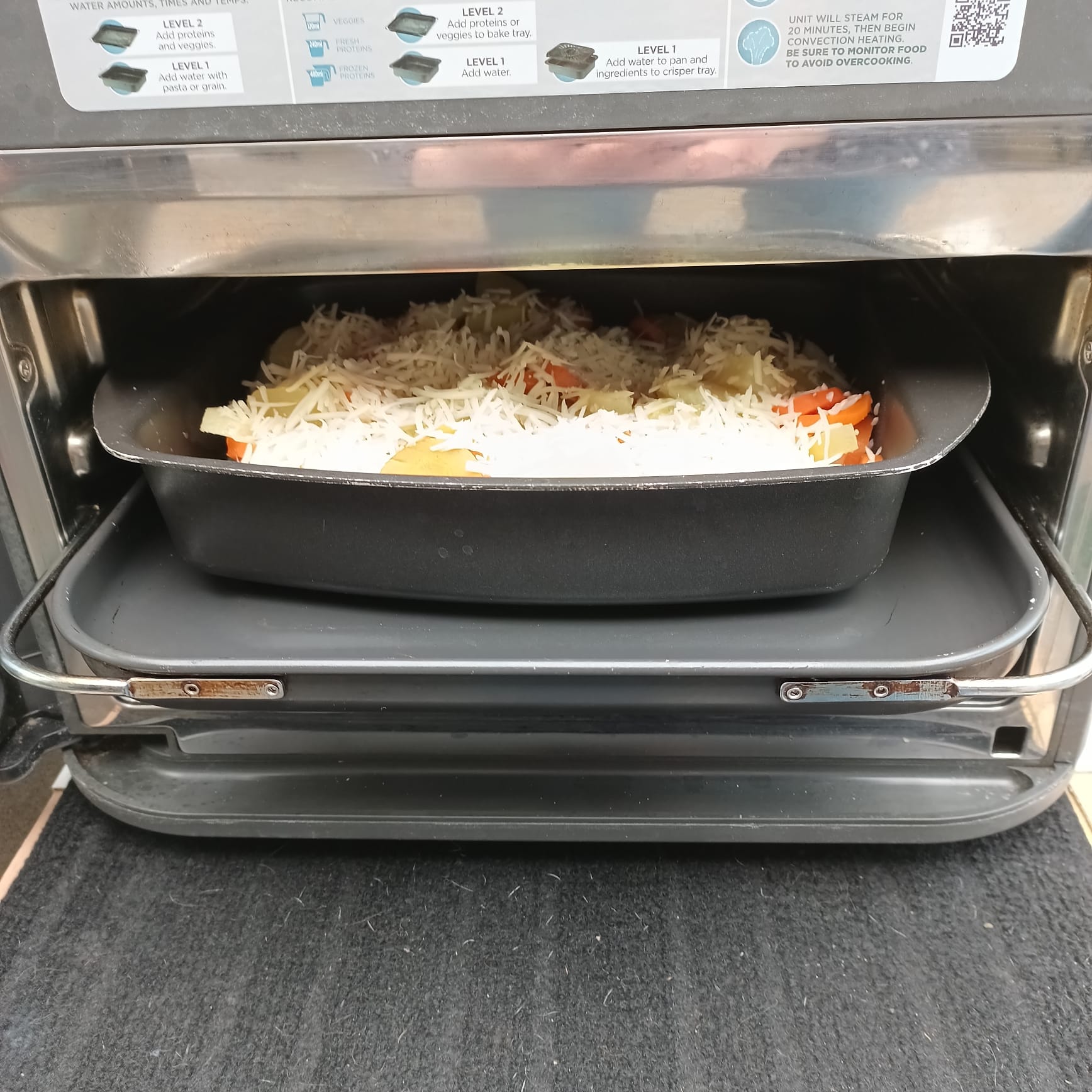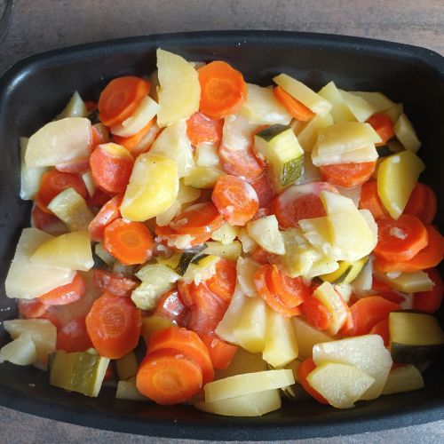 Cuire 4 pommes de terre , 4 carottes , 2 courgettes coupées en rondelles et en morceaux en mode STREAM durant 15 minutes avec 25 cl d'eau chaude dans le plat combi avec la grille.