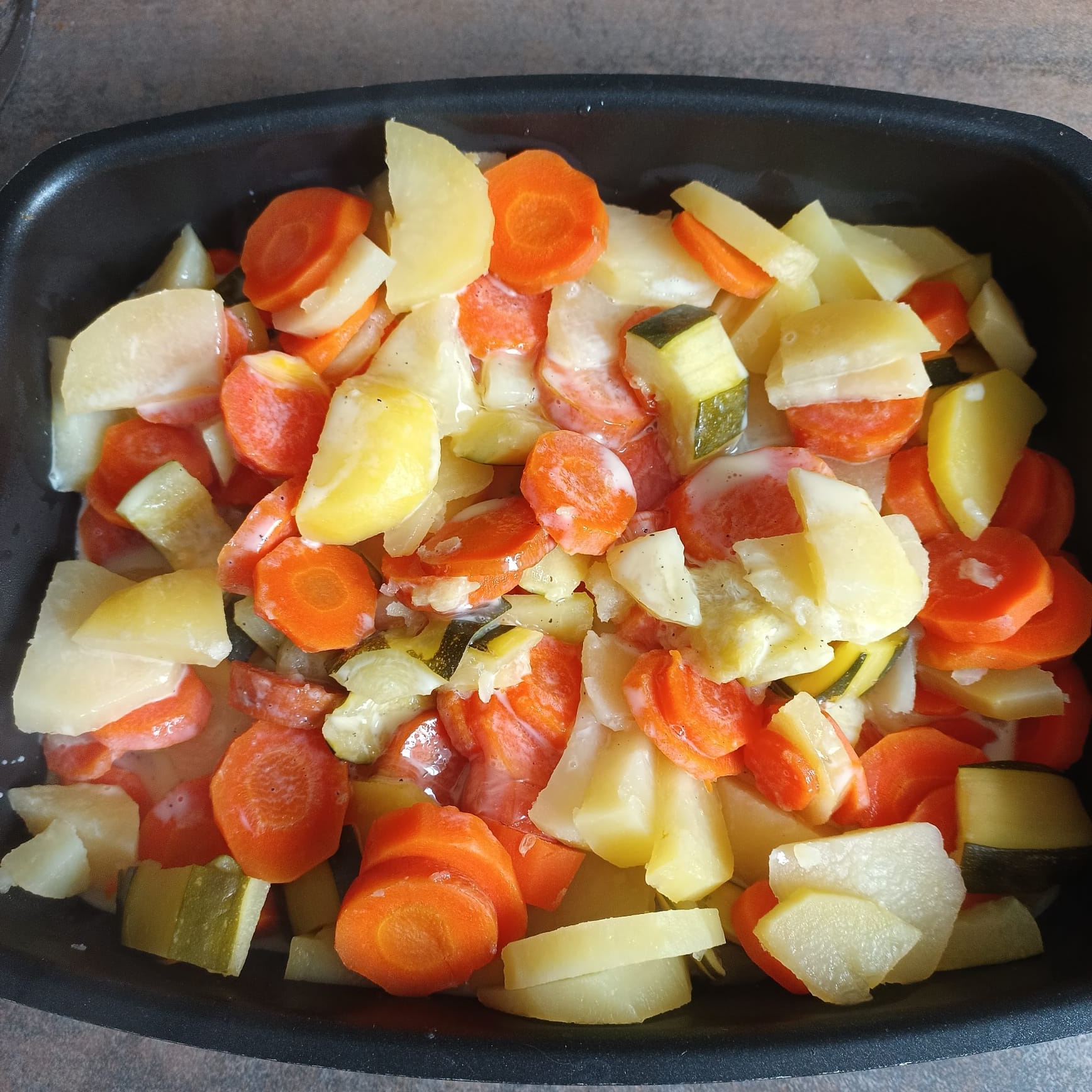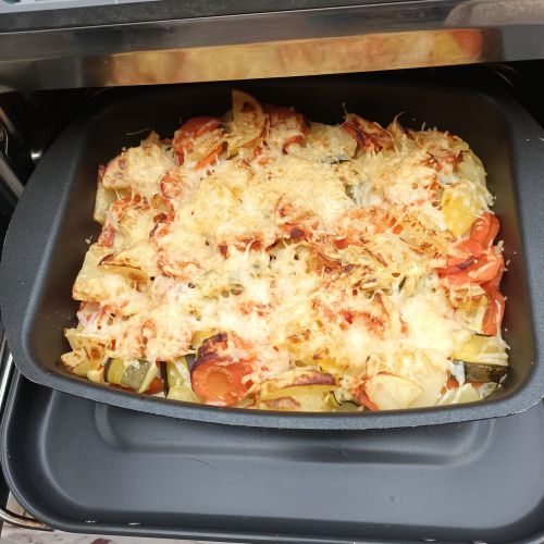 Mélanger 2 oeufs + 10 cl de lait demi-écrémé + sel poivre persillade verser sur les légumes ; parsemer 70 g de gruyère râpé.