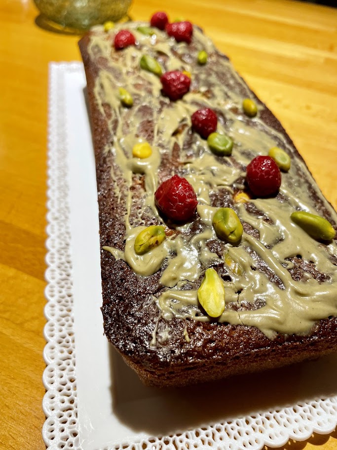 Quand le gâteau est refroidi, rajouter un peu de pate de pistache sur le dessus et y coller quelques pistaches et quelques framboises