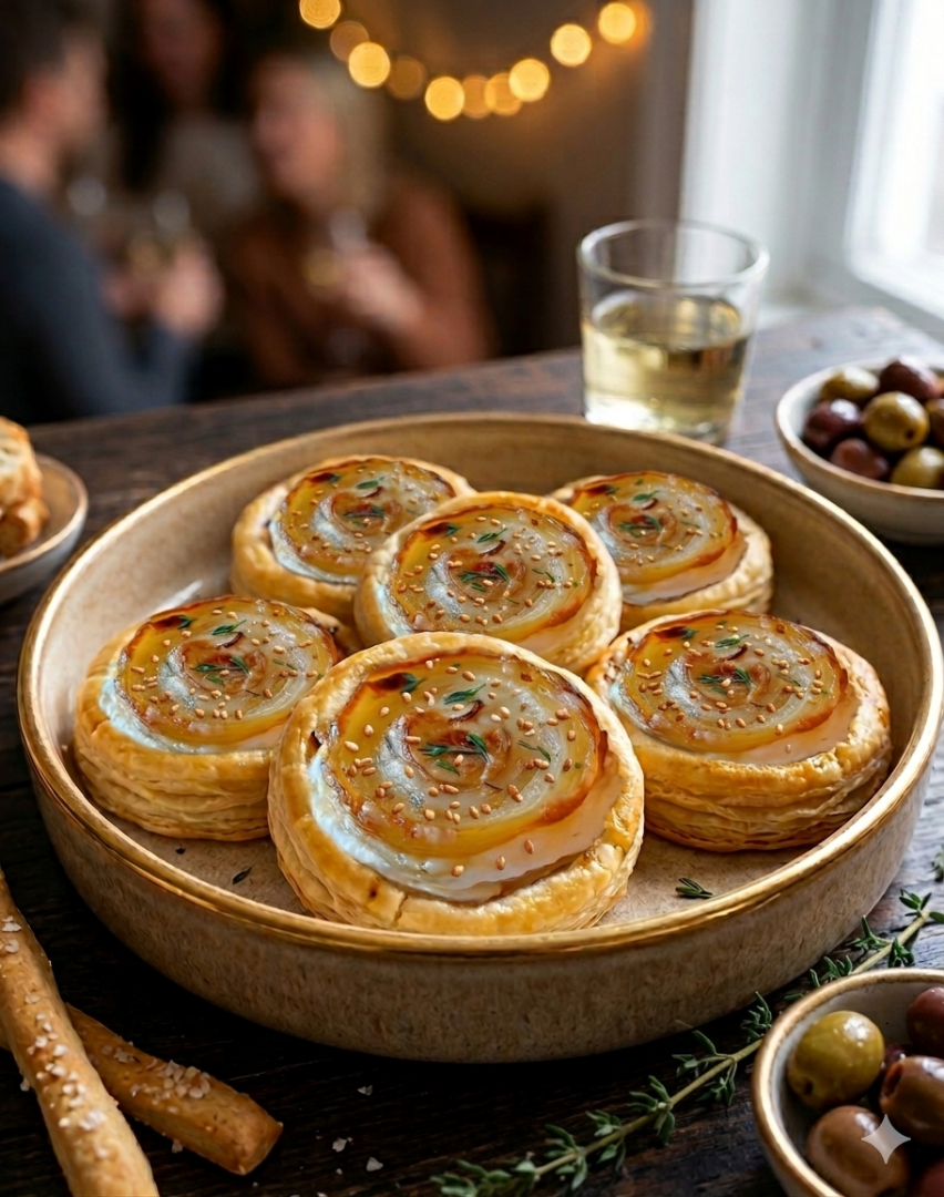 Servez chaud à l’apéritif, ces feuilletés sont un régal avec leur alliance de chèvre fondant et de confit d’oignon sucré.