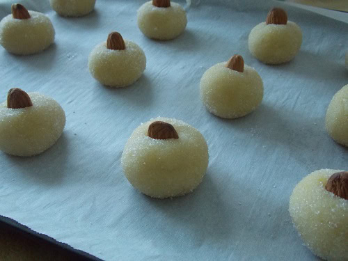 Déposer au centre de chaque boule une amande entière en les aplatissant légèrement.