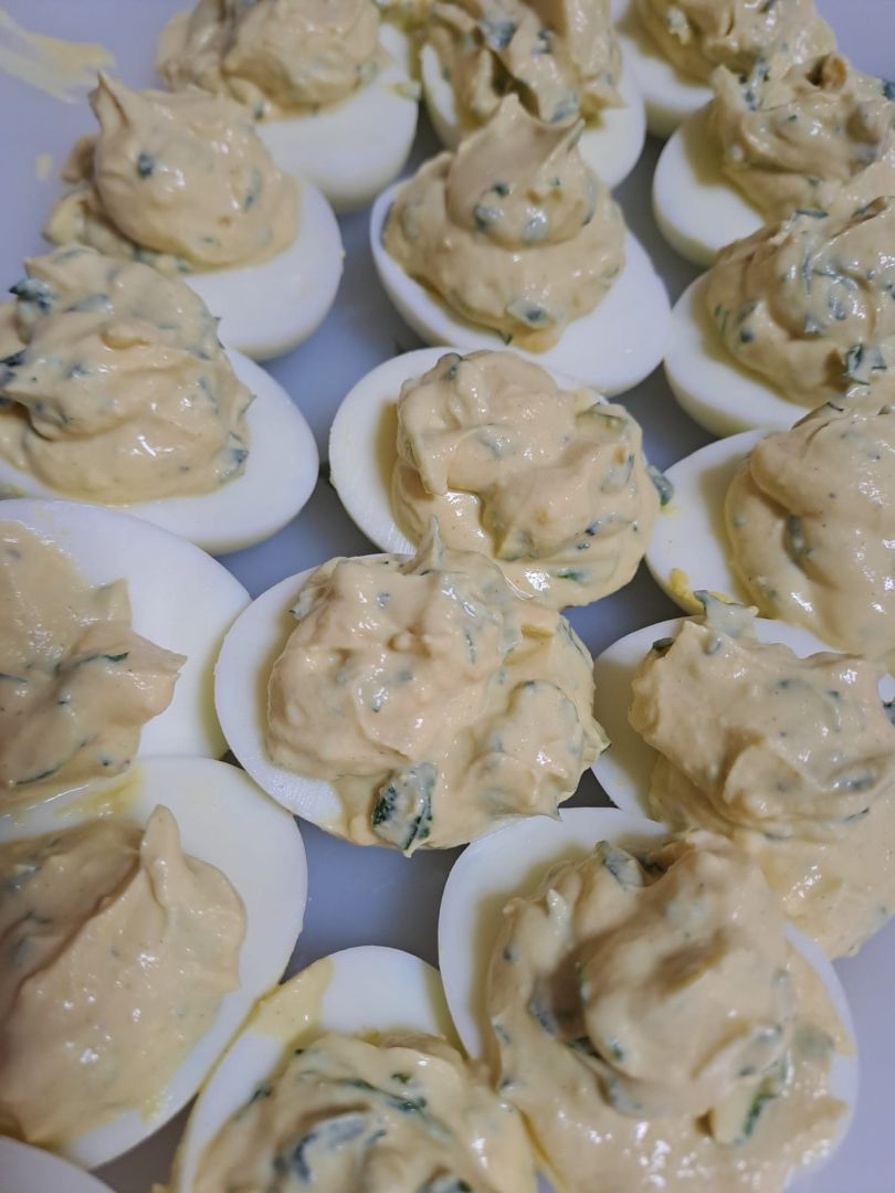 Coupez les œufs en deux, retirez les jaunes et écrasez-les avec la moutarde, le Skyr et les herbes.