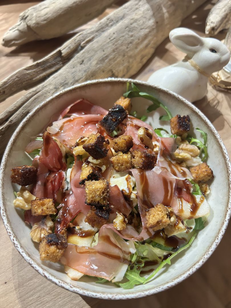 Ajouter le jambon en chiffonnade et parsemer de noix.